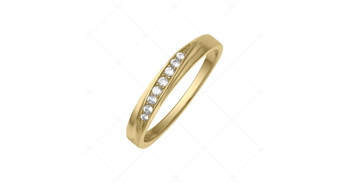 Antiallergén, 316L nemesacél gyűrű, 18K arany bevonattal. Különleges kialakítású fejrésze enyhén mélyített, haránt vonalban fut, amelyet szikrázó, víztiszta cirkónia drágakövek díszítenek.