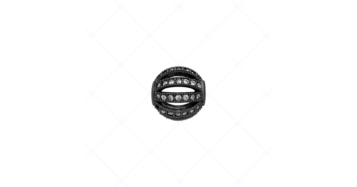 Üreges, gömb alakú spacer charm. Különleges kialakítású, körbe víztiszta, cirkónia kristályokkal kirakott kiegészítő. Rézből készült, fekete króm PVD bevonattal. A spacerek biztosítják, hogy a charmjaid és a gyöngyök ne csússzanak szét a karkötőn.