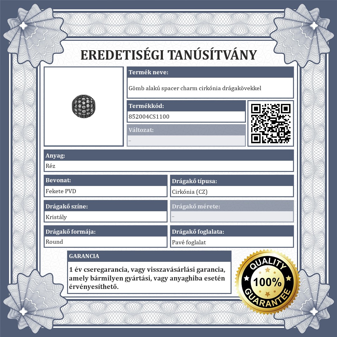 Gömb alakú spacer charm. Körben víztiszta, csillogó cirkónia drágakövek díszítik. Rézből készült, fekete króm PVD bevonattal. A spacerek biztosítják, hogy a charmjaid és a gyöngyök ne csússzanak szét a karkötőn.
