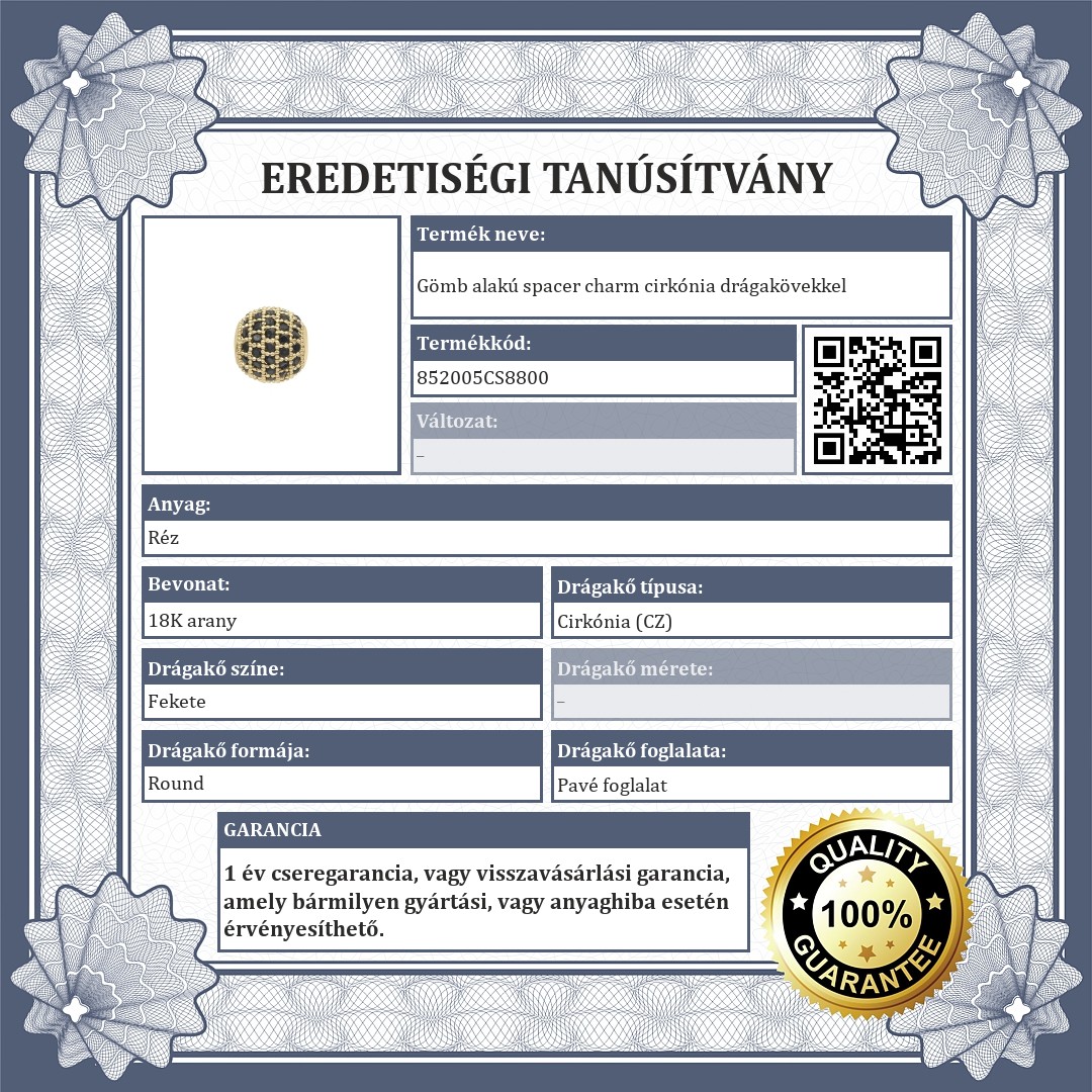 Gömb alakú spacer charm. Körben fekete, csillogó cirkónia drágakövek díszítik. Rézből készült, 18K arany bevonattal ellátott kiegészítő. A spacerek biztosítják, hogy a charmjaid és a gyöngyök ne csússzanak szét a karkötőn.