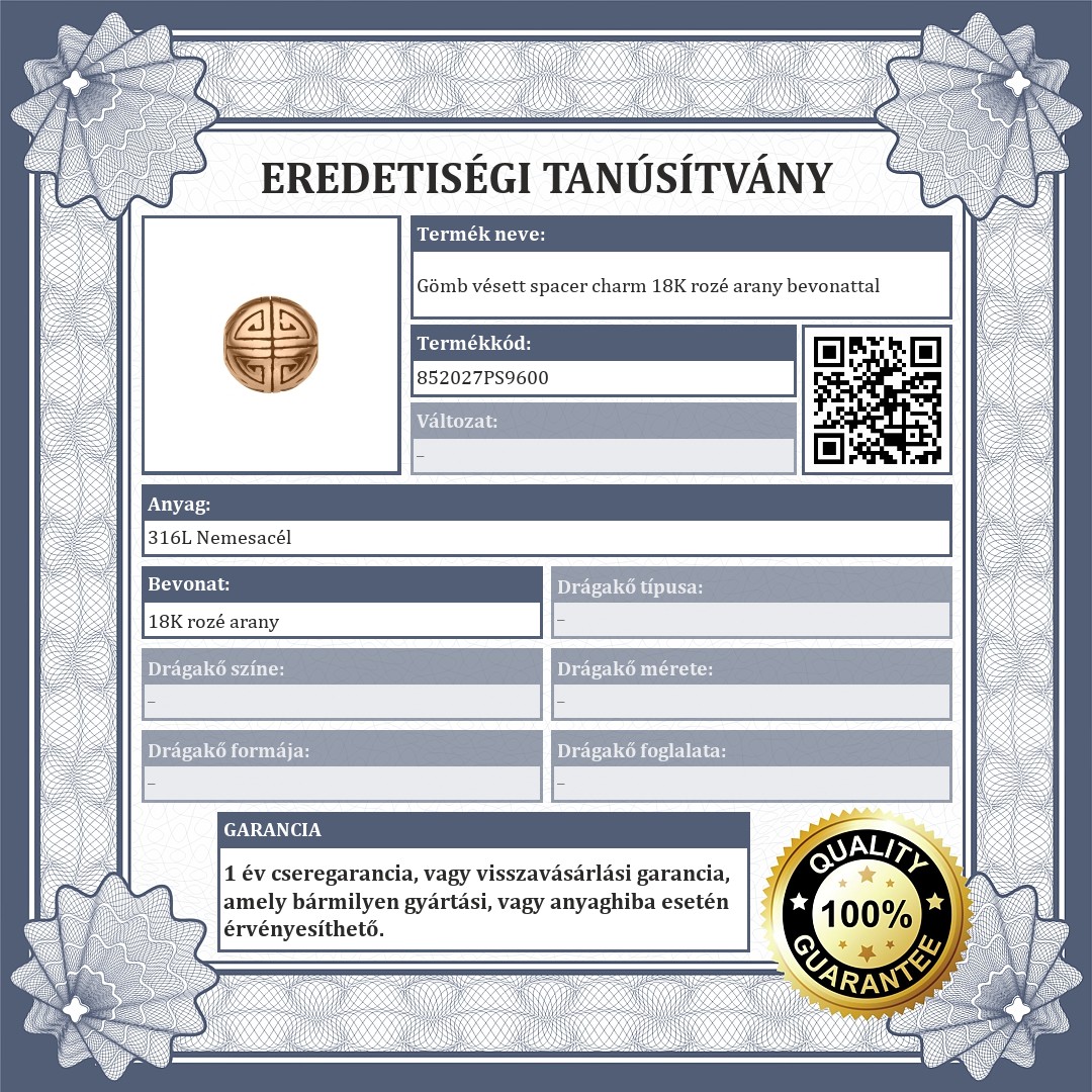 Gömb alakú spacer charm, amelyet vésett motívumok díszítenek körben. 316L orvosi nemesacélból készült kiegészítő, 18K rozé arany bevonattal ellátva. A spacerek biztosítják,hogy a charmok és a gyöngyök ne csússzanak el a karkötődön.