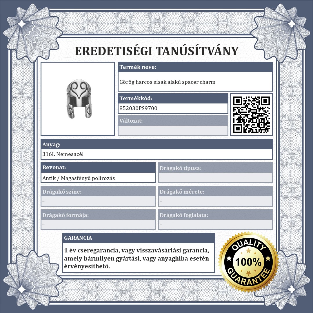 Görög harcos sisak alakú spacer charm. 316L orvosi nemesacélból készült kiegészítő, különleges antikolt hatású felülettel. A spacerek biztosítják,hogy a charmok és a gyöngyök ne csússzanak el a karkötődön.