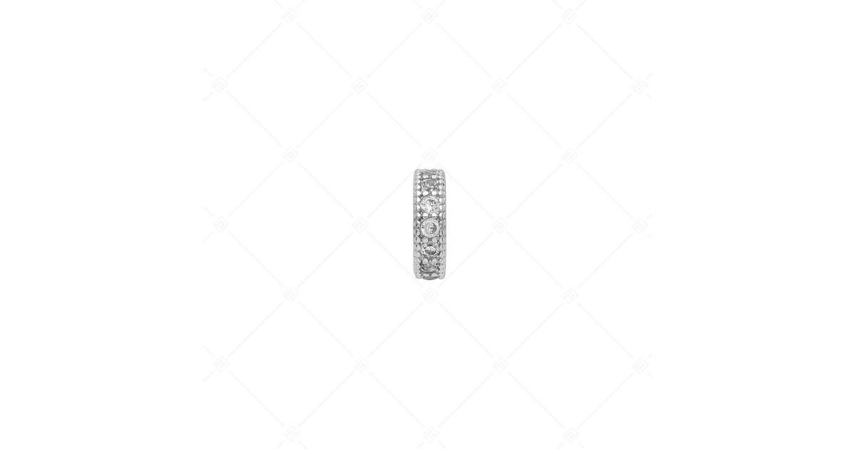 Kerek víztiszta, cirkónia kövekkel kirakott úgynevezett spacer charm. Rézből készült 925 Sterling ezüst bevonattal ellátott kiegészítő. A spacerek biztosítják, hogy a charmjaid és a gyöngyök ne csússzanak szét a karkötőn.