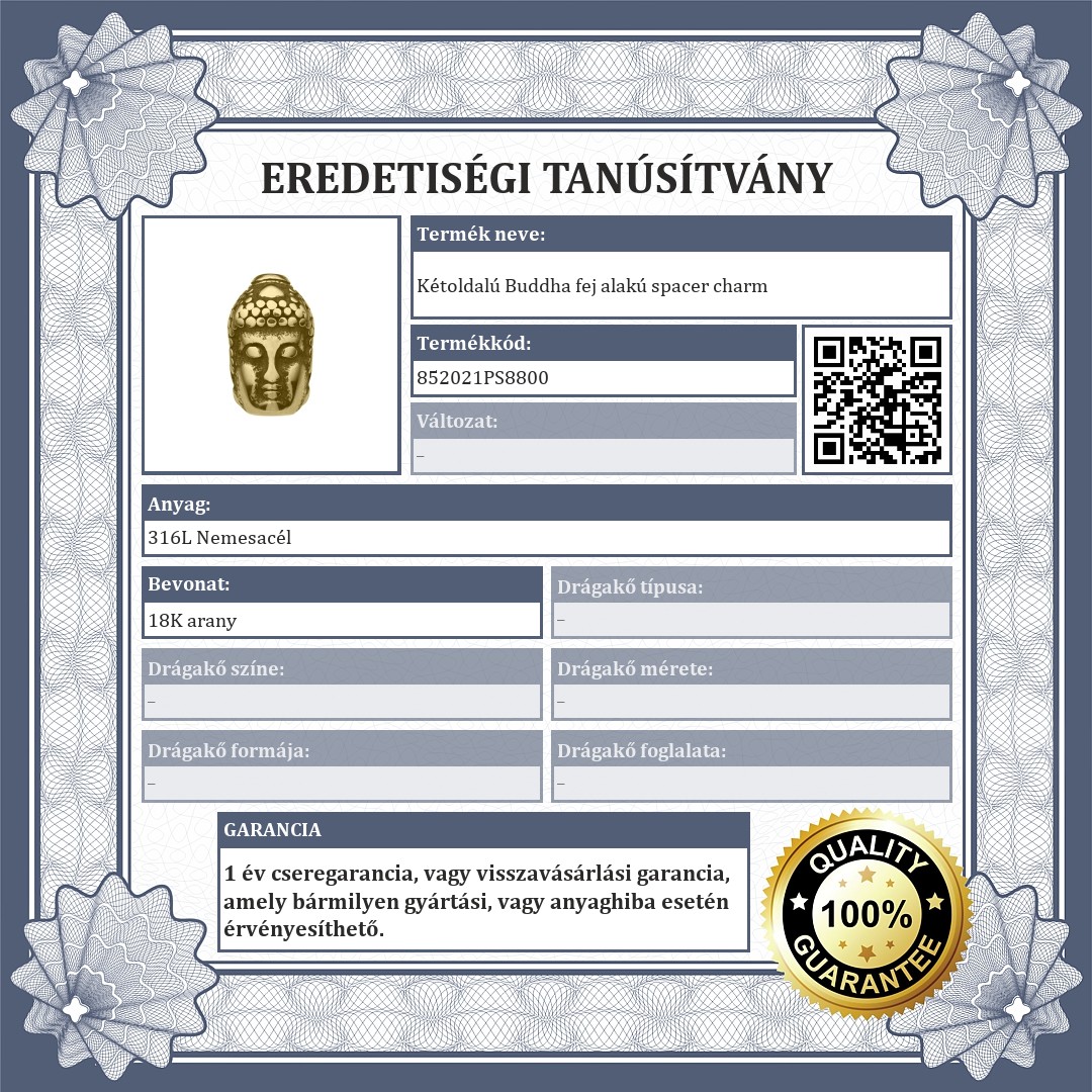 Buddha fej alakú spacer charm. 316L orvosi nemesacélból készült kiegészítő, 18K arany bevonattal. Kiváló minőségű, nem kopik, nem mattul el használat során. A spacerek biztosítják,hogy a charmok és a gyöngyök ne csússzanak el a karkötődön.