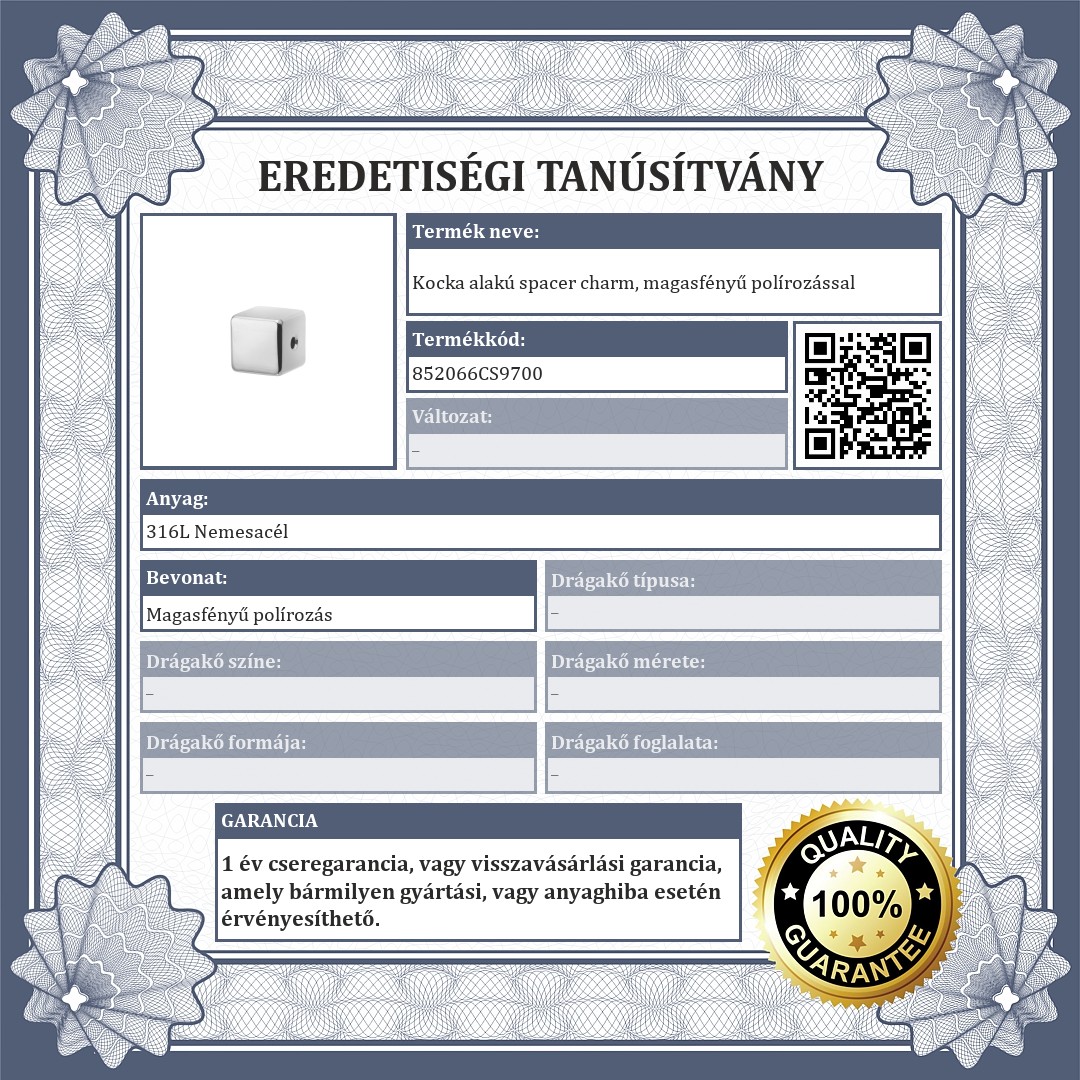 Kocka alakú spacer charm, 316L orvosi nemesacélból készült, magasfényű polírozással. A spacerek biztosítják,hogy a charmok és a gyöngyök ne csússzanak el a karkötődön.