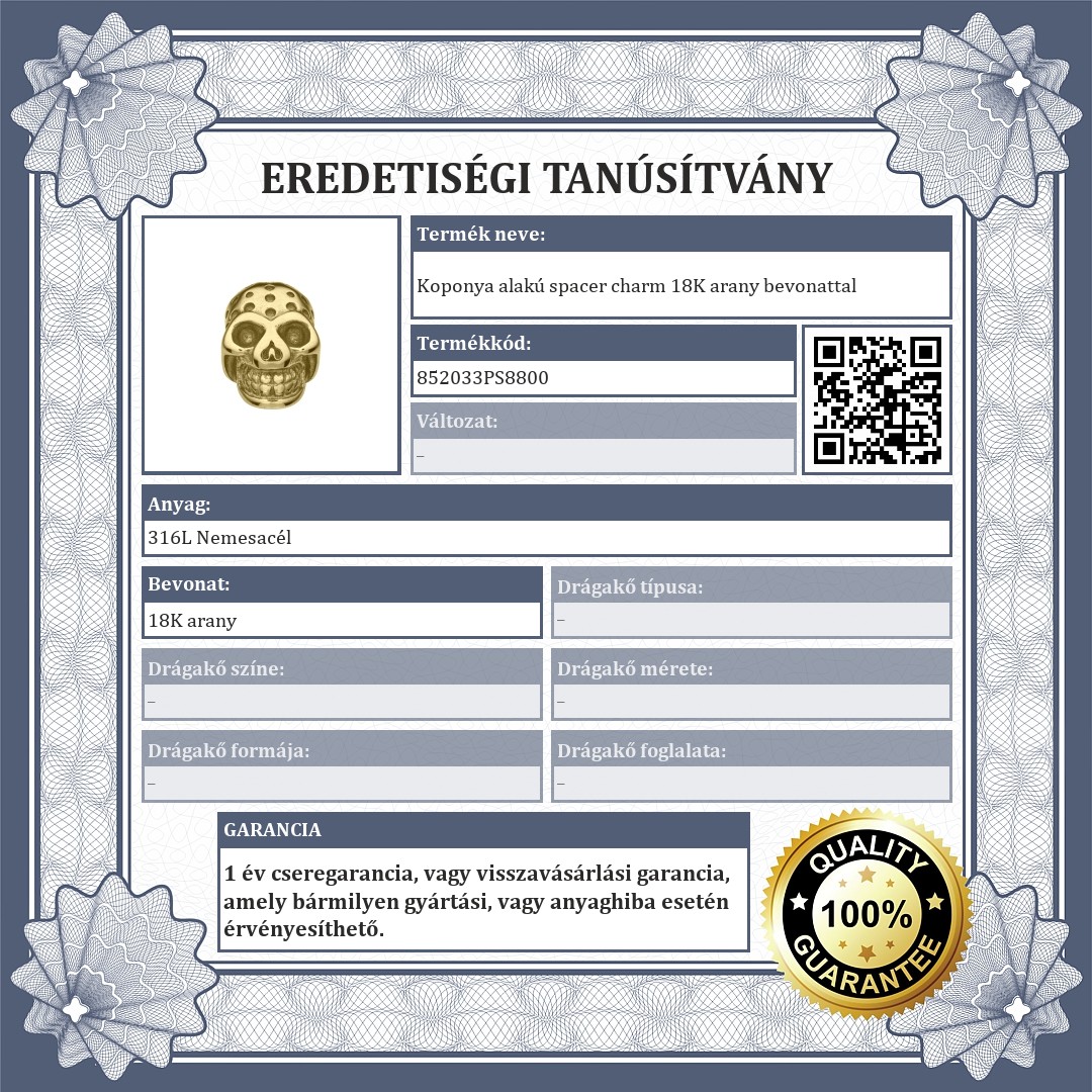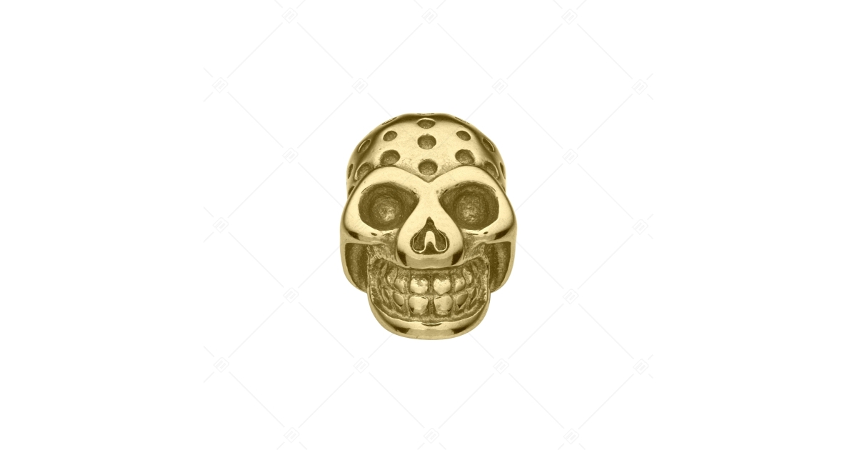 Koponya alakú spacer charm, melynek felületét mélyedések díszítik. 316L orvosi nemesacélból készült kiegészítő, 18K arany bevonattal ellátva. A spacerek biztosítják,hogy a charmok és a gyöngyök ne csússzanak el a karkötődön.