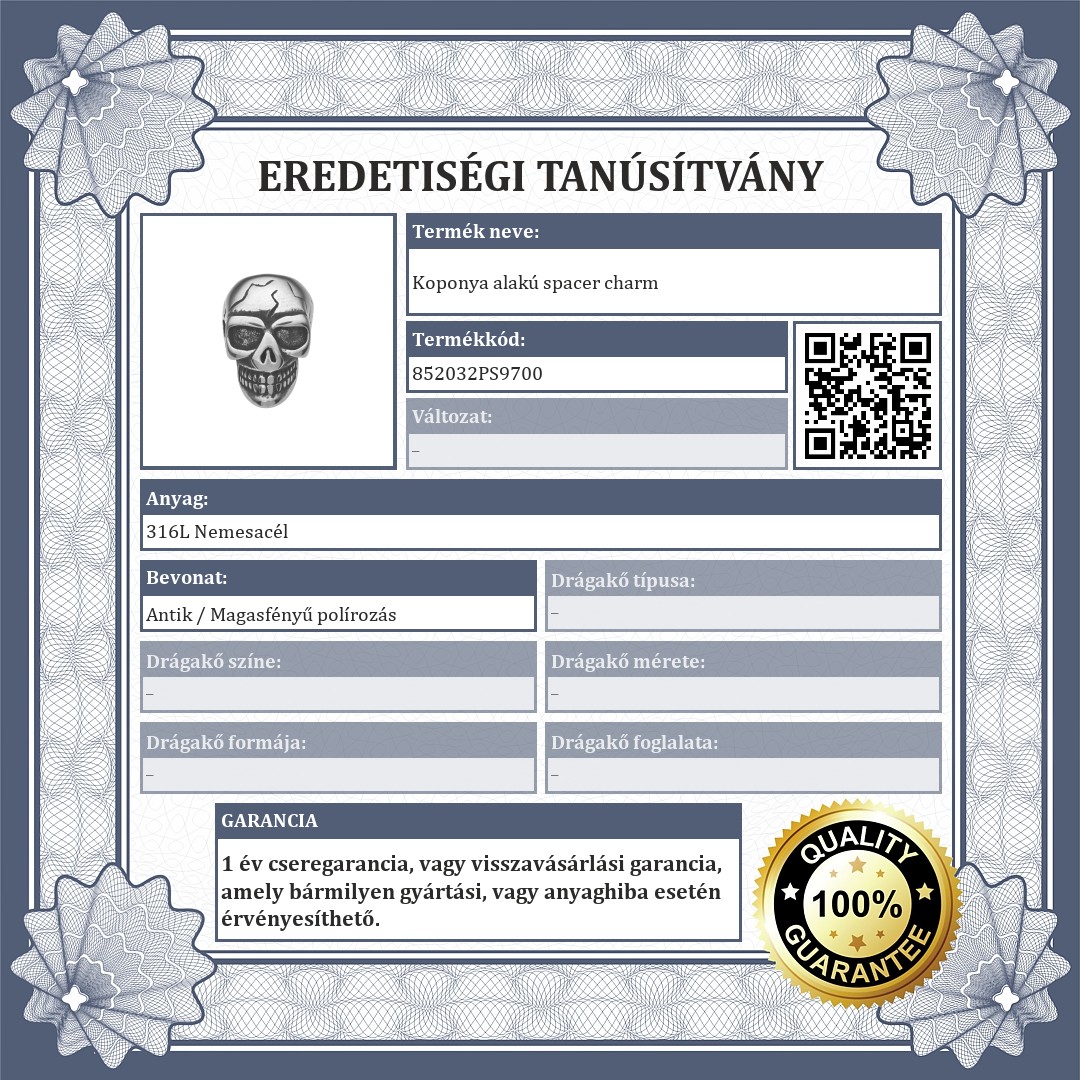 Koponya alakú spacer charm. 316L orvosi nemesacélból készült kiegészítő, különleges antikolt hatású felülettel. A spacerek biztosítják,hogy a charmok és a gyöngyök ne csússzanak el a karkötődön.
