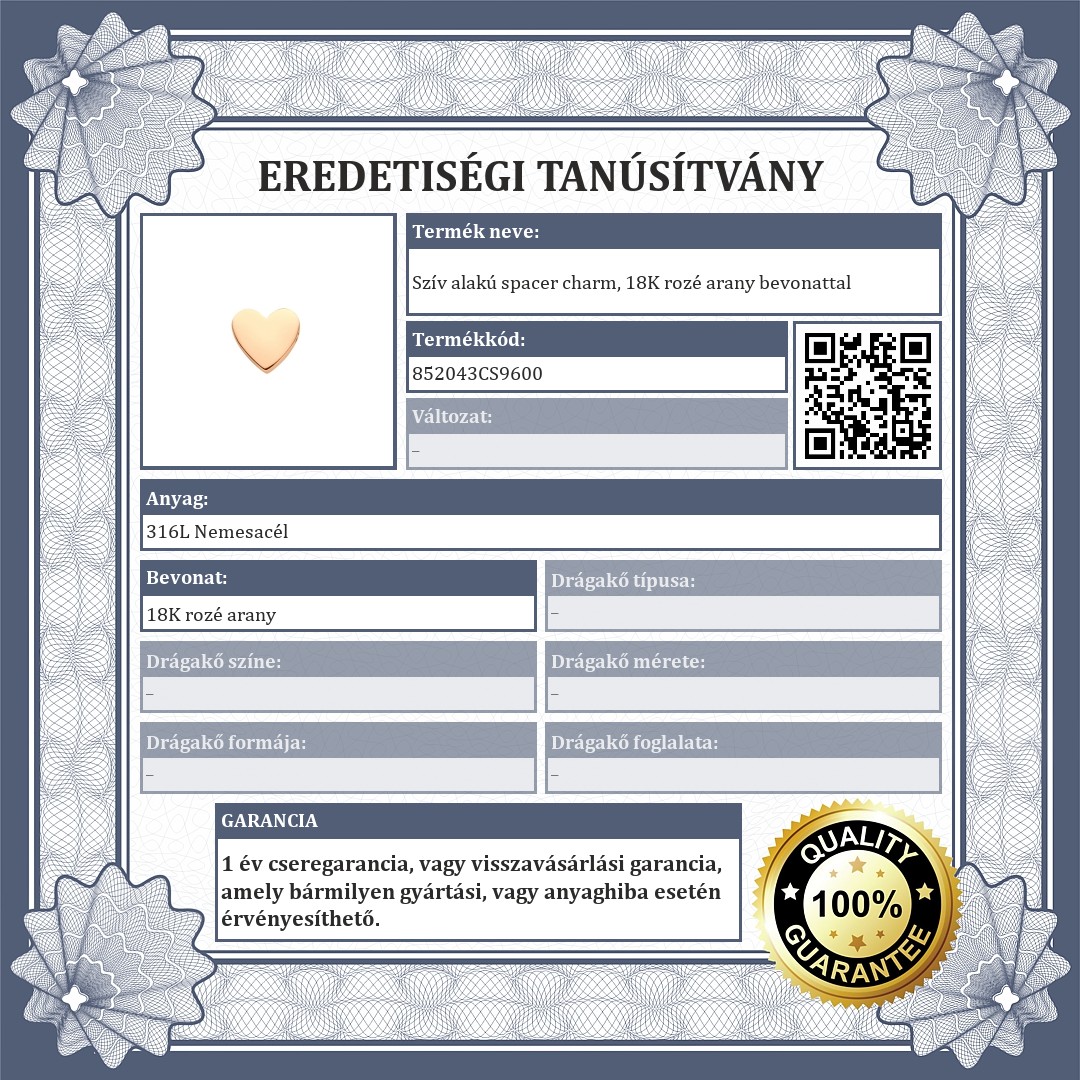 Rozé arany színű, szív alakú spacer charm. Antiallergén nemesacélból készült kiegészítő, 18K rozé arany bevonattal. A spacerek biztosítják,hogy a charmok és a gyöngyök ne csússzanak el a karkötődön.