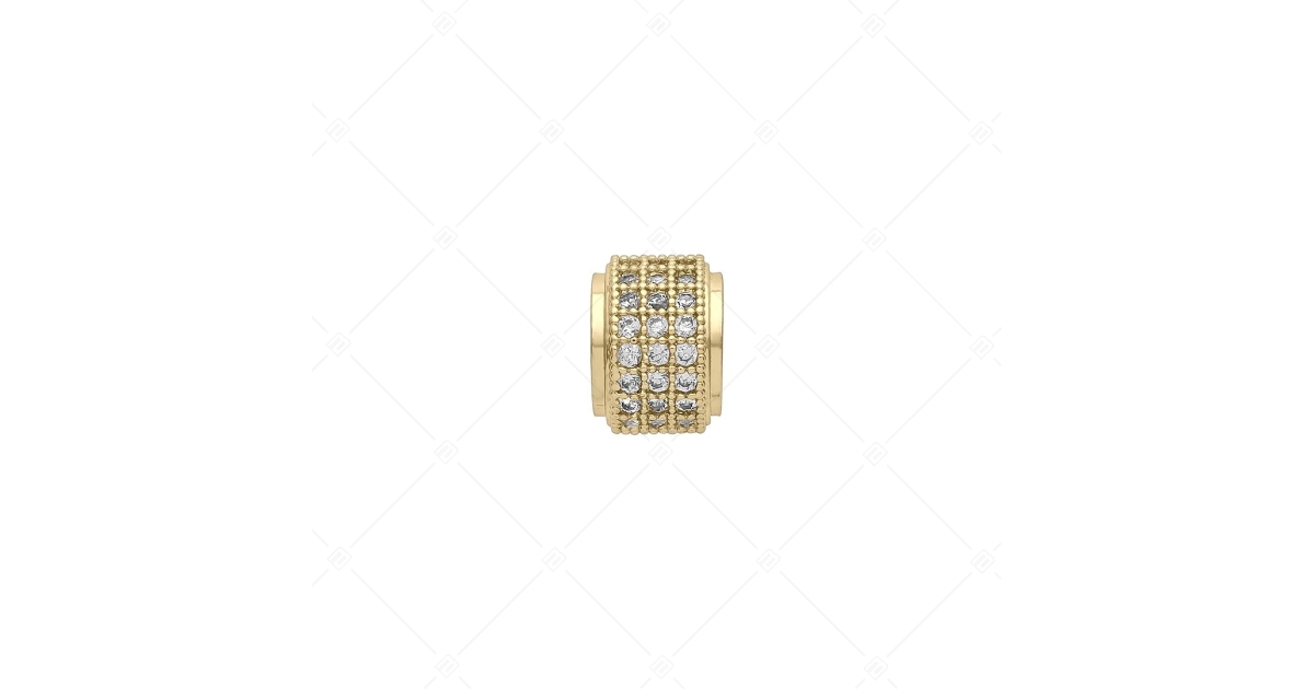 Vastag kerek, úgynevezett spacer charm, amelyet több sorban, körben víztiszta cirkónia kristályok díszítenek. Rézből készült, 18K arany bevonattal ellátva. A spacerek biztosítják, hogy a charmjaid és a gyöngyök ne csússzanak szét a karkötőn.