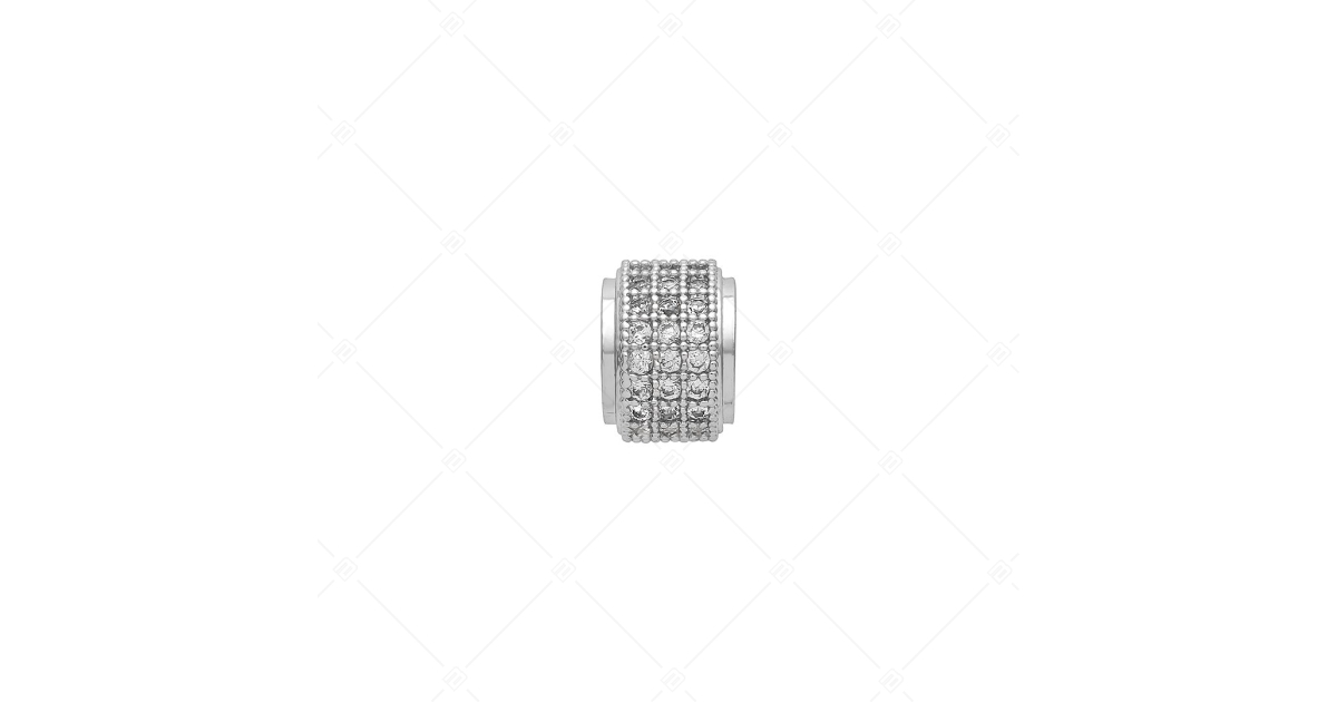 Vastag kerek, úgynevezett spacer charm, amelyet több sorban, körben víztiszta cirkónia kristályok díszítenek. Rézből készült, 925 Sterling ezüst bevonattal ellátott kiegészítő. A spacerek biztosítják, hogy a charmjaid és a gyöngyök ne csússzanak szét a karkötőn.
