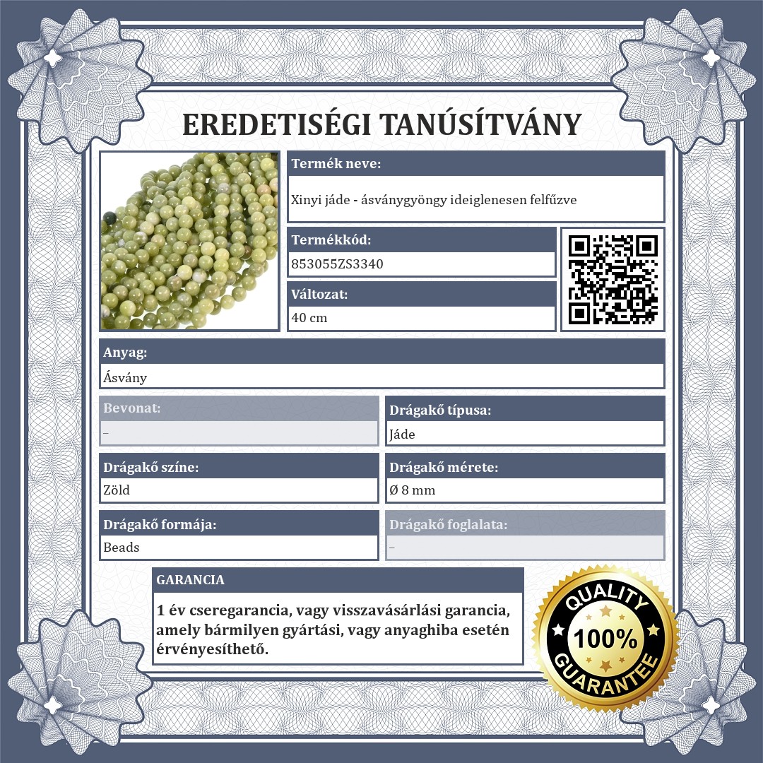 | Drágakő színe: | Halvány olivin zöld / Zsálya szín / Sárgásfehér |